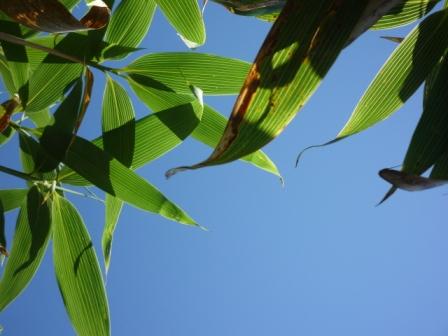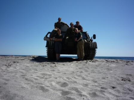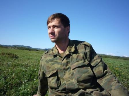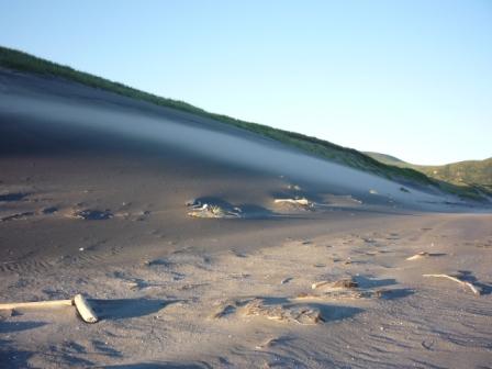 Около 15 ч начался подъем дороги. Идти становилось все сложнее – бамбук становился совсем густым, а колея перешла в пунктирную тропу. Воду приходилось экономить, так как с утра набрать ее было больше негде. За 100-200 м до хорошо видимого перевала к тропе справа и слева подступили невысокие склоны того самого хребта. Жара и уже невыносимый бамбук затруднили движение настолько, что Катя предложила вылезти наверх на разведку местонахождения. Оставив Владимира с рюкзаками внизу, мы вскарабкались на гребень. Там растительность была по колено, в том числе невысокий кедровый стланик, но самое приятное - встречалась ягода клоповка! Это было как подарок – она хорошо утоляет жажду. Океан сверкал слева в нескольких километрах от нас. Решили двигаться по гребням в сторону берега до спуска вправо в русло ручья Сухого. Вернулись к Владимиру, поднимаемся вместе с рюкзаками и двигаемся прямо по гребню, затем сворачиваем влево на развилке, и снова вперед. Примерно через час спускаемся вправо к ручью, закрепив веревку на ствол дерева. ВОДА!!! Как мало нужно для счастья! Холодная, чистая, журчащая в тени… Однако вечерело (было около 17 ч). Поэтому надеваем болотники и двигаем вниз по руслу. Судя по отчету за 1997 г., расстояние от перевала до океана составляет 4 км, но видимо, это напрямик по карте, а по извилистому руслу - да кто бы знал бы... Ручей бежит сквозь лес. По его берегам много растений, сочная зелень, огромные лопухи (в отличие от бамбука, ломаются они очень легко!). По пути была наклонная белая каменная стенка, опускавшаяся прямо в ручей. Сначала поток был полноводный, и попадались маленькие водопады высотой около метра, но затем вода стала уходить в землю. Мы набрали запас воды на всякий случай (5 л и две бутылки по 1.5 л). Уже почти стемнело, стало прохладно, но даже шума прибоя не было слышно. Вода в ручье исчезла (недаром он зовется - Сухой), дно стало песчаным, а русло - широким. Мы перелезали через упавшие стволы деревьев, и шли с фонариками по бесконечно петляющей дорожке еще немало времени… Потом из-за очередного поворота впереди раздался Катин возглас: «Ну наконец-то!!!», и мы вышли на берег. Было уже около 22 ч и совершенно темно. Хорошо, что вода была с собой. Мы поужинали и упали в палатки.