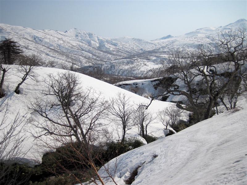 Еще через час остановились перекусить на ручье Круговом, за которым через несколько мостов начинается длительный подъем на перевал, называемый Горячеводский. Кстати, пока шли, на пути попадались... бабочки! Самые настоящие - с крыльями! Но сколько мы не гонялись за ними, ни одну даже сфотать не удалось - хотя одну я пытался заснять, но на фото ее совсем не заметно, настолько она сливалась с корой дерева, на котором она совершила посадку (какой-то трухляк). И зайцы нам не попались. Вот лису видели, но она далеко была, и очень быстро слиняла. После перевала достаточно ровный участок до серпантинного спуска на Первую Серную (хотя по карте она просто Серная). Спускались зигзагами - у Юрки лыжи деревяшки, не едут, а у нас с Ольгой пластиковые - катятся как надо... В общем, для меня был этот спуск был достаточно экстремальным - лыжи иногда тормозили сами по себе, из-за неоднородности снега, а когда это происходит на крутом спуске, то... такое притормаживание чревато потерей устойчивости... Что и случилось: я пропахал своим носом несколько метров весеннего снега... Юрка все это видел, т.к. к тому времени он спокойно уже сошел вниз, и долго смеялся... А я думал, что будет хуже... Но, удачно пропахал - небольшая ссадина на носу и подбородке, без последствий! В полпервого подошли к ГеоТЭС.