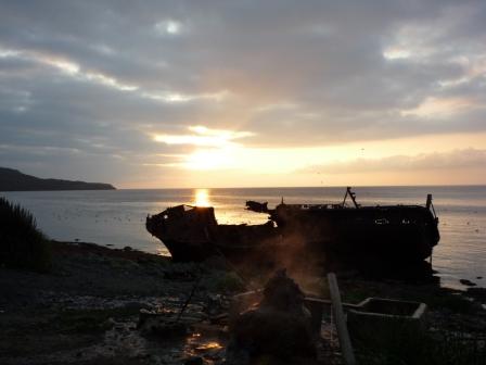16 сентября. Брусника с шоколадом (вулкан Баранского с двух сторон и сверху) Подъем в 5 утра, небо ясное. После завтрака уходим наверх вправо, по крутому распадку между скалами, цепляясь за бамбук. Далее продолжается сухое русло ручья Кислого. Камни, лежащие поперек стволы, извилистые ветки… Выше - пологопадающее каменное ложе, далее попадаются лужи с водой. Вода пока еще пригодна для питья. Затем проходим узкую расщелину, где рюкзаки пришлось проталкивать в щель. Впереди снова начинается сухое русло, доходим до крутопадающего каменного ложа. Выше – сухой водопад, рюкзаки поднимаем на веревке. Справа от водопада – осыпающийся склон. Появляется вода, но уже с явным кислым вкусом. Развилка на два сухих русла, идем по левому. Появляется каменная порода красноватого цвета. Следующий сухой водопад обходим справа, по склону, заросшему ольховым стлаником, мелкой березой, травой. Бамбука здесь уже мало, он низкий, не мешает идти. Перекусываем сухофруктами, глядя на проплывающие внизу облака. Они сильно закрывают вид на океан, но проглядывает мыс Исоя и скала Дырявая! А над нами – ясное небо, солнце, но вершина еще высоко… Подъем становится очень крутым, идем по распадку с породами красноватого цвета. Выше виднеется фумарольное поле, и чувствуется запах серы. Склоны крутые, высокие и сыпучие. Опасно... Лично мне было очень не себе.... А оказывается, я умею так вдохновенно ругаться!!! (почти сползая со склона под весом рюкзака). Катя (скалолазка!) залезла первая и скинула веревку. Остальные поднимались на веревке, рюкзаки тоже привязывали и тянули – сначала до скалы, потом до сухого стланика, где была привязана веревка. Дойдя по низкому сухому стланику до высоты фумарол, мы решили уточнить правильность передвижения (Мегафон уже работал!) . «Сокол, сокол, я гнездо! Ответьте!» - позвонили мы диспетчеру… то есть, Юре. Получив несколько полезных подсказок, обходим фумаролы слева и поверху. Круто вверх ползем… ползем… ползем… Под руки попадается мелкий кустарник и ягоды – брусника, клоповка, рябина… ТАМ СТОЛЬКО БРУСНИКИ! Она также отлично утоляет жажду! Кислая, сочная, что еще в жару для счастья надо! Сияет солнце. Под нами внизу – густые облака. Дует ветер.