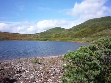 С утра опять туман. Да что ж это такое! Но тут небо нас услышало, поняло правильно и неожиданно быстро разъяснилось. И оказалось, что мы и вправду находимся на берегу очень красивого озера Лопастного, слева – вулкан Иван Грозный, а прямо - сопка. Вот! Но вскоре опять натянуло туман, и сегодняшние планы покорить Грозный окончательно развеялись. Юра и Саня ушли продолжать рубку тропы, вскоре мы полезли за ними. Сначала мы карабкались по невысокому бамбуку, потом начинается собственно, свежевырубленная тропа сквозь косой стланик. Кстати, в процессе рубки стланика были убиты мачете и топор. От тропы мы продирались опять наверх, через стланик, и так до макушки. Тут небо разъяснилось уже надолго, и с сопки открылся вид на семь вулканов: Богдан, Баранский, Тебенькова, Мачеху, Дракон, Грозный и Ермак! Через долину вился лентой ручей Многоозерный, исчезающий в каньоне большого водопада! И раз уж мы не пошли на Грозный, то водопад уж надо увидеть обязательно, и после обеда мы туда и направились.