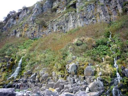 Ниже уклон стал более пологим, а русло расширилось. Приходилось постоянно переходить с одного берега на другой, а некоторые участки обходить по берегам (сначала по сухим руслам, скрывающимся в бамбуках, потом появились какие-то остатки тропы). В 16 ч спешно пообедали около упавшей через ручей огромной лиственницы. Заметно ощутилась усталость. Шутка ли – целый день топать в болотниках, да еще почти все время вниз, плюс постоянные броды ручья по камням, ставшим скользкими и перекатывающимся… В общем, колени были просто никакие. По пути встретился очень красивый клен, опадающий желтыми листьями. Солнце уже клонилось к закату, когда мы дошли до «стакана» и испили минералки. Неподалеку слышались выстрелы со стрельбища Горячих Ключей. Теперь попадались более хоженые тропы, а заодно тушки тухлой рыбы после браконьерской рыбалки. Телефон уловил сигнал сотовой сети, и Леша позвонил своему брату Игорю с просьбой забрать нас от моста у выезда из п. Горячие Ключи. К 19 часам мы прошли мимо реки, видели фанзы на другом берегу и таки вышли к мосту! УРА! Долгожданное переобувание в треккинги! Первая звезда в небе! Вдали синеют контуры вершин Грозного. Мимо проносятся военные на БТР. В общем, вечерняя идиллия! Игорь сначала проехал мимо нас, но вскоре вернулся. Обрадовались, выпили пива: «За встречу, за окончание похода, за День Рожденья!». Погрузили в машину 6 рюкзаков, втиснулись всемером и понеслись с музыкой в темноту, держа курс на Курильск и предвкушая баню (Санька позвал народ в гости)… Едем, пьем пиво, грызем сухарики, на небе россыпи огромных звезд… И вдруг… ВРРРЖЖЖУУХХХХ!!! И машина осела на левый задний угол. ОТВАЛИЛОСЬ КОЛЕСО! М-дааа… приключения продолжаются! Поиски при свете фонариков увенчались успехом – артефакт нашелся в канаве. Прикрутить колесо не удавалось, а из зоны приема сотовой связи мы уже выехали. Впору было затянуть: «Выйду ночью в поле с конем…» Тут сзади показался свет фар попутной машины. Это были два хабаровских охранника с Куйбышевского рыбзавода, которые 10 дней назад подвезли нас четверых в сторону бухты Золотой. Они весьма удивились обстоятельствам встречи, но остановились помочь с колесом, а затем вместе с Лешей съездили в Ключи, чтобы дозвониться до подмоги, точнее – до Андрея (который был за штурвалом вездехода, подобравшего нас у Черных скал три недели назад). После возвращения мужчины привинтили колесо обратно, и мы потихоньку поехали обратно в Ключи. Там и подождали Андрея. Он приехал на крутом джипе и привез еще пива. Поздоровались, выпили «за встречу, за окончание похода, за День Рожденья!», и поехали с новой скоростью в Курильск. По пути останавливались на питьевом источнике у дороги, выложенном камушками. Примерно через час пути мы были в Курильске. Юра с Андреем отправились на Баранский за машиной, что так и стояла в кустах и вскоре вернулись. А мы заехали на сейсмостанцию, к Ирине Геннадьевне. Оказалось, что за эту неделю появился еще один гость – сотрудник научного института с Южно-Сахалинска. Потом отправились к Сане Есаулову в гости. Как приятно было отмыться в бане и почувствовать себя человеком! В процессе обмена фотографиями и неспешной болтовни в непоходной обстановке, выяснилось, что теплоход изменил свое расписание из-за очередной непогоды, и ближайший рейс будет завтра. К этому времени Кате уже н