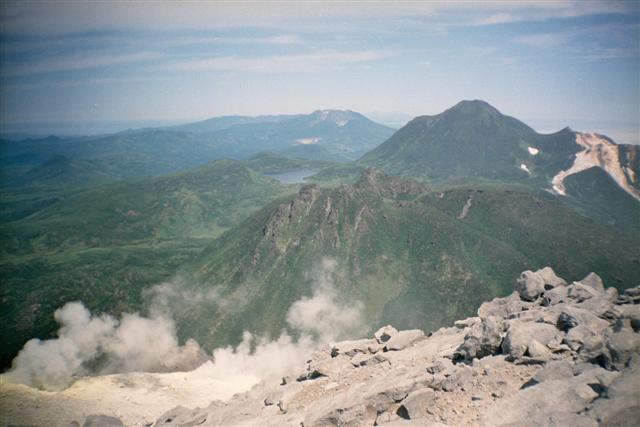 Потом проехали еще немного, за 3-ю Серную, там оставили в бамбуках машину. Нацепили рюкзаки, обули лучшую обувь для путешествий по острову Итуруп - болотные сапоги, и, в путь дорожку! А дорожка пролегала сначала до реки Серной. Это большая река, как Курилка, только вода в ней серная, рыба в ней не водится, и впадает она в Тихий океан. Чуть вниз по течению в нее впадает ручей Нагорный. Я бы не сказал, что это ручей - целая речища! Конечно, поменьше чем Серная, но такая же многоводная и бурная. Вот вода в этом ручье пресная, и рыба водится. Шли по берегам, периодически на перекатах пересекая ручей, выбирая лучший путь - в основном скакали по камням, стараясь лишний раз не шлепнуться в воду и не зачерпнуть воды в болотники. Камни почти всегда были покрыты какими-то водорослями, но как-то поособенному, участками по 200-300 м - то зеленые водоросли, то серые, то скользкие коричневые, то вообще без водорослей. Растительность на камнях была связана с притоками к ручью - бывали притоки с пресной водой, бывали с кислой, соленой, серной, и от этого и вода не совсем пресная, но рыба - жила! Ночевку устроили еще на большой воде - выбрали подходящий участок, вырезали на нем бамбук, поставили палатку. Приготовили ужин. Я попытался половить рыбу - поймал штук пять. За ужином, когда уже стемнело, немного выпили и закусили, за такой серьезный поход...
