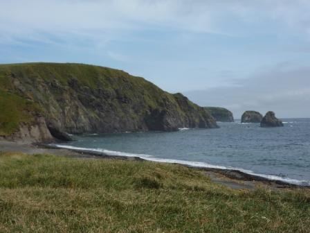6 октября Край Света Рано поутру небо обнаружилось ясным и чистым. Ура! Над океаном из-за горизонта вставало солнце. Я собрала палатку и рюкзак, мы с Сергеем выпили чаю. Он угостил свежевыпеченным хлебом (прямо из печки!). На Край Света я отправилась налегке. Напрямик там не пройдешь, хотя мыс, кажется, совсем рядом, но надо либо обойти несколько узких бухт, либо пройти по крутым склонам вниз-вверх. Между мысом Краб и Краем Света обнаружились две удобные для стоянок бухточки с ручьями. Сверху к ним можно легко подойти от наезженных дорог. Слева от Края Света – очень высокие красивые утесы, напоминающие пейзажи из фильмов фэнтези. Сам мыс отделен от берега скалистым перешейком, по которому вьется тропинка. Мыс обрывается в океан скалистыми берегами, а макушка ровная - плато, поросшее невысокой мягкой травой, низкими кустами ягоды, похожей на рябину, таким же маленьким бамбуком. С Края Света отлично видно мыс Краб с маяком и множество прибрежных скал- обломков утесов. Чайки… Солнышко… Волны… Утесы… и до самых Гавайев больше нет островов, только тысячи километров открытой воды.