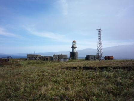 Пока мы с Сергеем пили чай в домике, ветром принесло туман, и панораму Края Света заволокло пеленой. Смысла идти туда не было, а уже дело было к вечеру. Поэтому я села в домике записывать в тетрадку впечатления про поход, а Сергей занялся хозяйственными делами. В 19 ч он завел дизель, и – да будет свет! – появилось электричество. В тот вечер мы до поздней ночи мы смотрели DVD. В силу образа жизни и предпочтений я сто лет не зависала перед экраном, а тут – НА КРАЮ СВЕТА – мы смотрели кино. М-да-а-а… Сергей сам родом с Приморья, с острова Попова, что ныне входит в черту города Владивостока. Угостил меня местными яблоками и виноградом с огорода! Когда стемнело, заработал маяк. Судов сейчас мало, пояснил Сергей – сайру уже заканчивают ловить. А вся сайра ловится около Шикотана. На материке консервы делают из замороженной рыбы, а свежая сайра – только шикотанского изготовления, в период с мая по октябрь, пока идет лов. Несмотря на ветер, было удивительно тепло. Проснувшись ночью, я вынырнула из палатки под фантастически звездное небо. Эта темнота периодически озарялась медленной вспышкой сверху – маяк посылал очередной сигнал в бесконечность, и становилось видно его верхнюю площадку и круглый балкончик, а затем снова медленно погружался во тьму.
