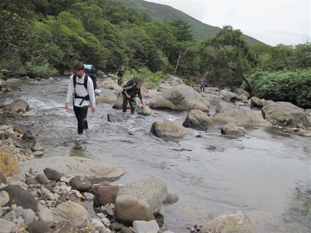 В болоте ручья Многоозерного очень много клюквы. Прям промышленные масштабы. Можно поставить домик клюковика и организовывать экспедиции за клюквой, а вывозить вертолетом... Но мелковатая она, на болоте в Курильске крупнее. Лагерь поставили на полянке возле озера Лопастного, немного в стланичке, надеясь, что он будет защищать палатки от ветра. Напрасно надеялись - хлестало и шатало палатки так, что иногда казалось поломает или унесет вместе с обитателями. Но ничего - выдержали испытание. Кушать готовили на костре, который разжигали горелкой. Полезная вещь, газовая горелка! Если бы не она, то с костром приходилось бы мучатся не по туристски - дрова абсолютно мокрые, да еще и свежак. Ничем традиционным (бумага, порох) легко не разожжешь. Утром погодка не очень благоприятствовала. Но поближе к полудню разошлась. Юрка с Саней пошли продолжать рубить тропку через сопочку, чтоб полегче было на другую сторону озера перебраться. А остальные пошли туда же, любоваться окрестностями. Это была среда и в этот день Итуруп должен был посетить президент всея Руси! Как выяснилось позже - не посетил.